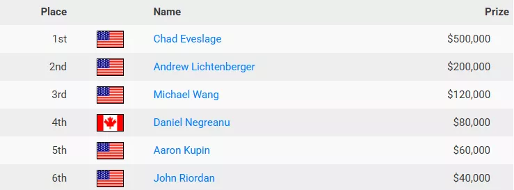 Участие стоило $1,000, каждый игрок официально мог сделать 10 входов (но некоторые делали гораздо больше, организаторы к этому относятся весьма лояльно). В этом году было зафиксировано 18,718 входов, гарантию в $15 млн перекрыли с запасом.