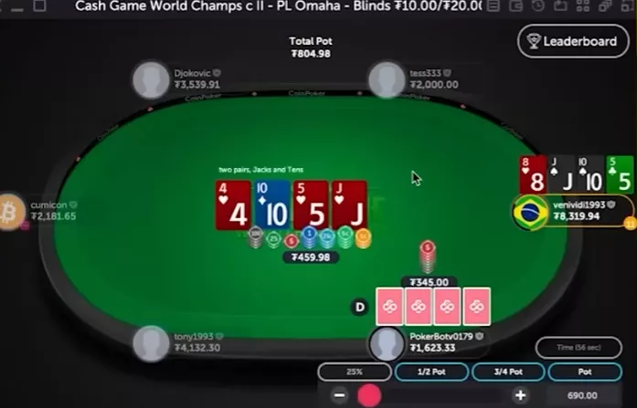 Первый оппонент чекает, катофф ставит банк, баттон фолдит. VeniVidi выставляется против катоффа. Тот показывает и выигрывает раздачу, когда на тёрне и ривере кладут две чёрные четвёрки.