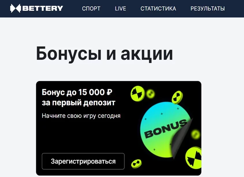 В начале 2024 года действует единственное предложение для ставок на спорт — приветственный бонус до 15,000 рублей. БК Bettery ранее не отличалась обилием промо. Очевидно, что другие бонусы и акции вряд ли появятся в будущем.