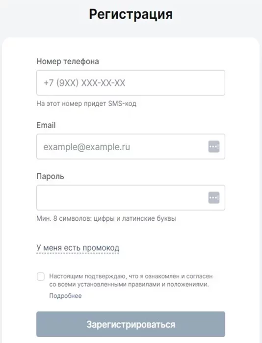 В регистрационной форме минимум полей: номер мобильного, e-mail, пароль и промокод. Последний можно поискать у партнеров букмекера в их Телеграм-каналах и соцсетях. Номер телефона и e-mail необходимо сразу подтверждать вводом проверочного кода из СМС и электронного письма.