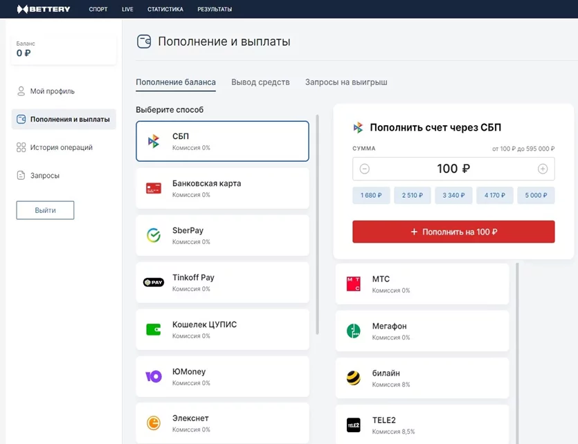 Минимальный депозит — 100 ₽ любым способом. Ограничение по максимуму — 595,000 ₽, для электронных кошельков и мобильных платежей — 15,000 ₽. Комиссия есть только при пополнении с Билайн (8%) и Теле2 (8.5%).