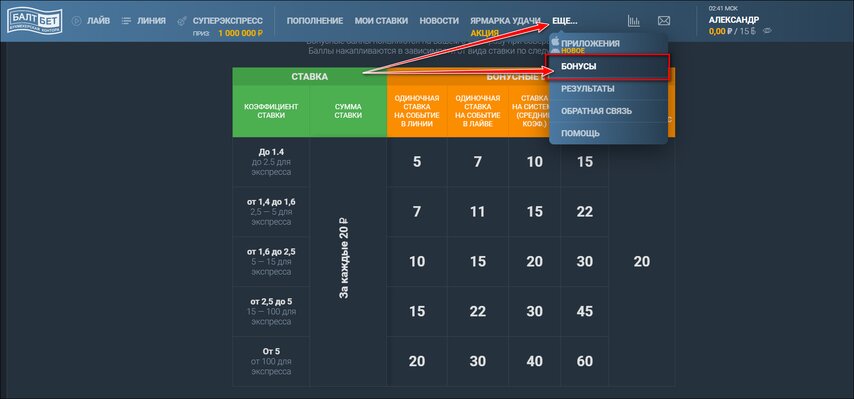 Фрибетов и других бонусов на первый депозит в БК нет, но пользователи Балтбет становятся участниками программы лояльности. Ее суть проста — за совершенные ставки можно получать специальные баллы. Их количество зависит от вида пари и коэффициента, чем он выше — тем больше бонусов будет зачислено на счет. После накопления определенного количество баллов их можно обменивать на рубли и заключать пари по курсу 1,000 к 1, то есть чтобы сделать ставку на ₽1,000, нужно иметь на балансе аккаунта 1,000,000 очков. Минимальный лимит — ₽20 или 20,000 бонусов.