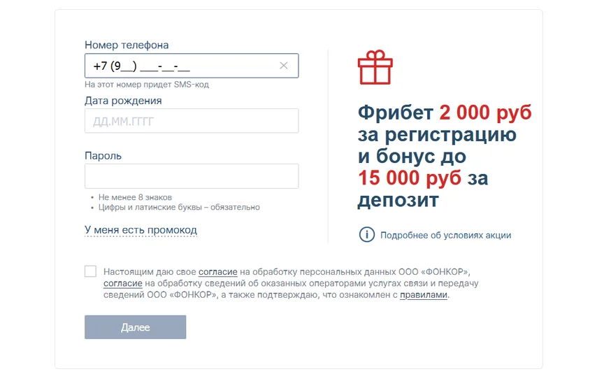 При отсутствии счета в центре управления, нужно указать дату рождения, номер телефона и промокод. Последний пункт — опциональный. Одной галочкой соглашаемся с правилами Фонбета, даем разрешение на обработку персональных данных и жмем «Далее».