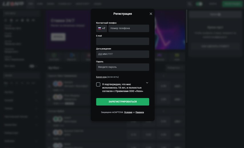 Для всех новых пользователей БК Leon предлагает в виде бонуса фрибет — нужно заполнить простую форму на первом этапе. Для этого на сайте нажимаете кнопку «Регистрация» в правом верхнем углу и вводите данные в обязательных полях. Они будут одинаковыми как в веб-версии, так и для мобильного приложения: