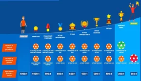 Всего в программе лояльности девять ступеней. Чем выше, тем лучше курс обмена коинов на деньги. Нет ограничений по времени на выполнение норматива для каждого уровня. Баллы начисляются за проигранные пари.