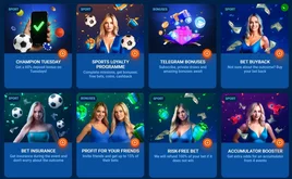 Нажав на него, можно поучаствовать в трех акциях: вращение колеса фортуны за депозит, 100 фриспинов в казино за установку мобильного приложения, бонусы в социальных сетях и мессенджерах.