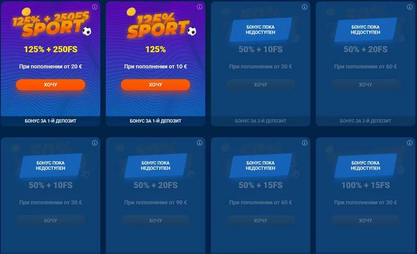 Во время написания данного обзора года на официальном сайте БК «Мостбет» объявлено 9 промо для ставок на спорт. Еще 10+ предлагаются игрокам казино. Далее расскажем, что есть у букмекера для пользователей из Германии. Бонусные программы для жителей разных стран отличаются.