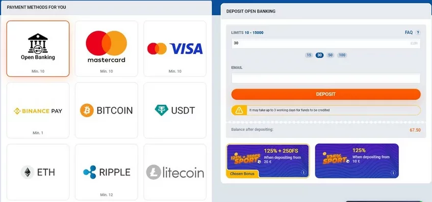 Минимальный депозит составляет €10. При платеже в криптовалютах лимиты разные: от €1 до €15 (эквивалент). При зачислении фиатных денег комиссий нет, но они обязательно будут для цифровых монет как оплата обработки транзакции блокчейном. Эти издержки — фиксированные, и обычно составляют €1—€1.5.
