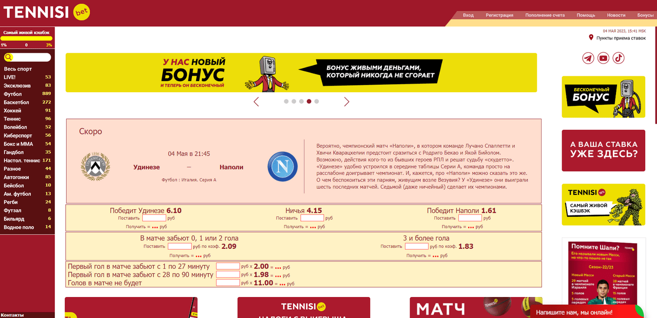 Если вы впервые зайдете на сайт букмекерской конторы Тенниси, может возникнуть ощущение, что дизайн не обновляли с момента создания компании в 1999 году. Однако это не мешает любителям беттинга заключать пари. На главной странице, помимо прочего, представлен главный матч дня по версии букмекера и его описание.