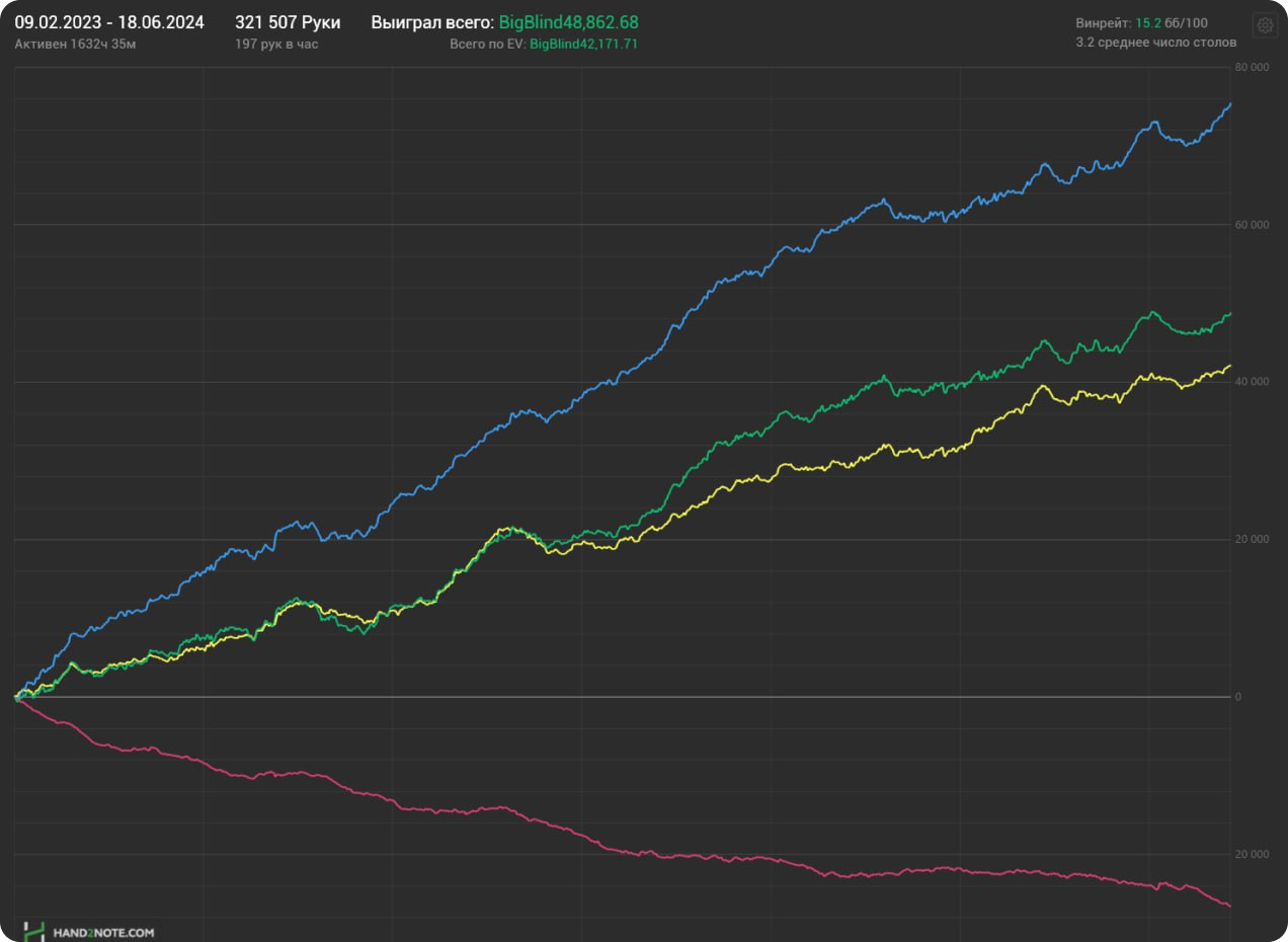 Играть в омаху — выгодно. Можно много говорить о том, что в омахе много экшена и фишей, но куда убедительней об этом скажут цифры. 14 bb/100 — это средний винрейт игроков фонда на PLO100-200. Если сравнивать с холдемом, то такие цифры встречаются только у лучших игроков!