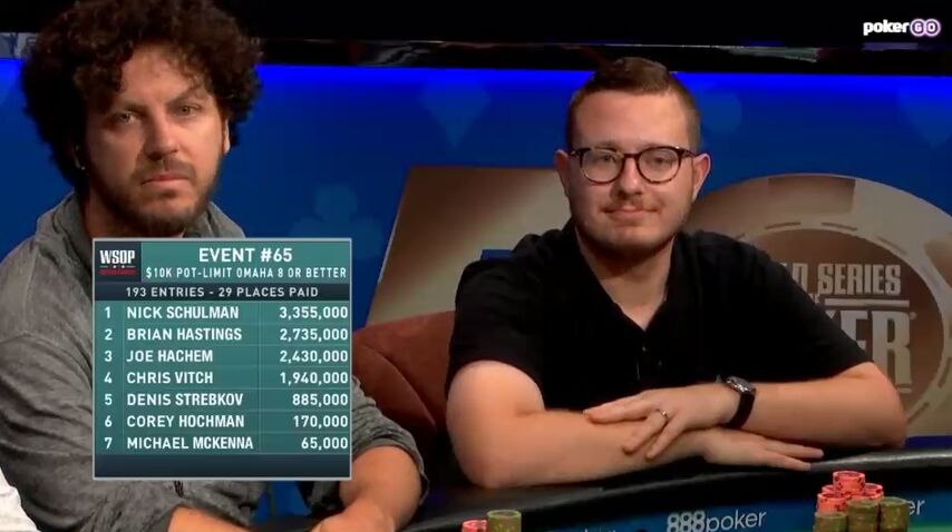 Среди оппонентов Шульмана по финальному столу был Денис «Адреналин» Стребков. Подняться выше четвёртого места не удалось, но присутствие Дениса было заметным. В студии PokerGO отметили его глубокий бас и даже предположили, что он выиграл российскую версию шоу «Голос». Ник Шульман отметил творческую раздачу, в которой они с Денисом по очереди взрывали друг другу мозг. Наверное, хэдз-ап между этими игроками украсил бы турнир, но вмешался Брайан Гастингс, не растерявший за время супружеской жизни умение доминировать в олл-инах. Заметно похудевший, но всё равно круглолицый, с аккуратной стрижкой, в очках с тонкой оправой и с неизменной улыбкой на лице Гастингс каким-то образом вызвал у одного из комментаторов ассоциации с деятелями германского нацизма. Чувствуется, что испорченная репутация Брайана продолжает влиять на то, как его воспринимают в покерном мире.
