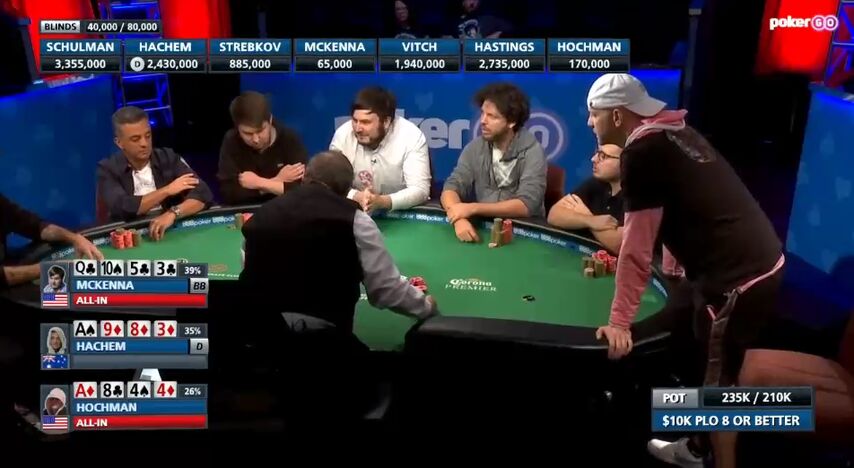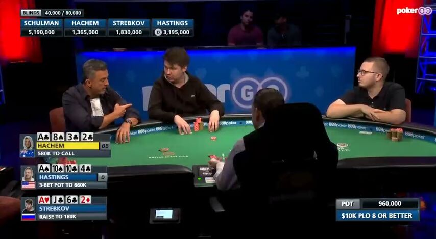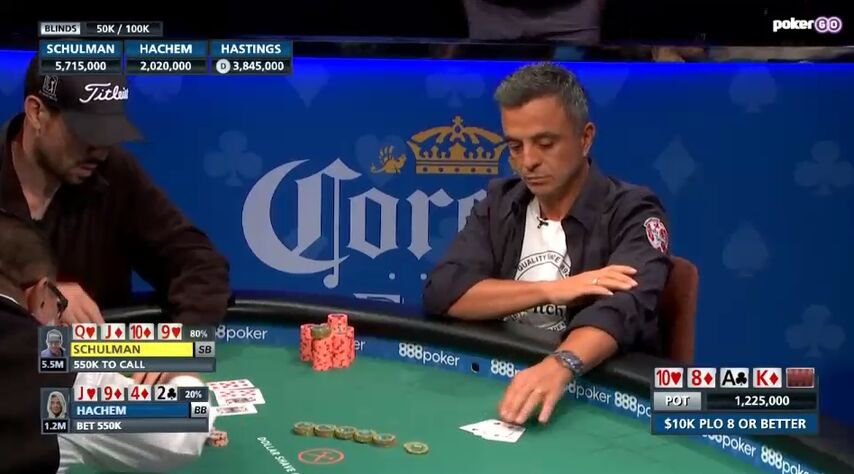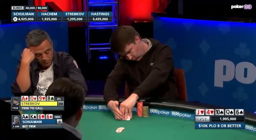 Гастингс выкинул, Шульман, естественно, сделал рэйз, загоняя соперника в олл-ин. Хашем моментально доставил, считая, что у него есть ауты и на лоу, и на скуп.