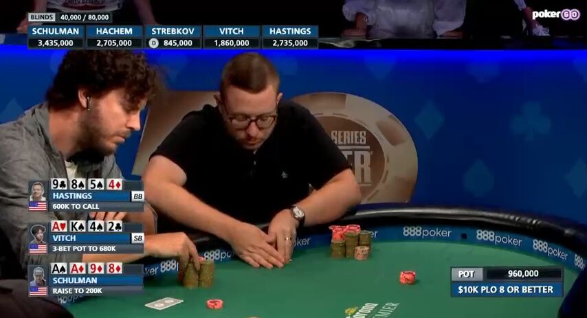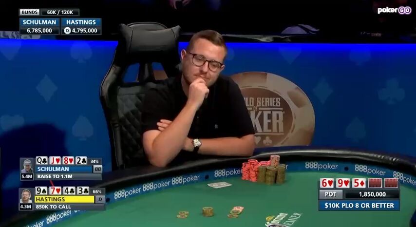 Сразу после этого при стеках 4,785,000 у Шульмана против 6,795,000 у Гастингса (блайнды 100k/200k) состоялась ключевая раздача матча.