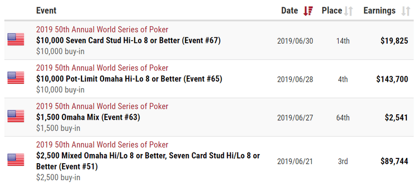 На тёрне положили 8d , повтор или хотя бы туз на ривере не пришёл, и Денис Стребков завершил чемпионат по пот-лимитной омахе хай-лоу на 4-м месте. Сразу после этого он отправился играть чемпионат по стаду хай-лоу, где тоже сумел попасть в деньги, хотя и выбыл задолго до финалки. Бывает, что успешным игрокам из интернета нужно время, чтобы привыкнуть к живой игре, особенностям американских любителей и тому подобное. Однако королю COOP'ов по микс-играм на первой для него Мировой серии период адаптации не понадобился.