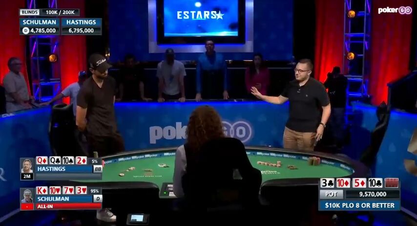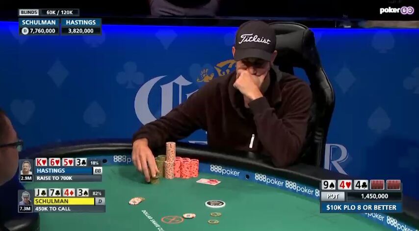 Правда, по выходу двойки Шульман поставил олл-ин, и Гастингс несколько минут мучительно думал над коллом, но потом всё же заплатил и увидел, насколько отличную карту открыли на ривере. Шульмана же подобный исход потенциально победного кулера заметно разозлил.