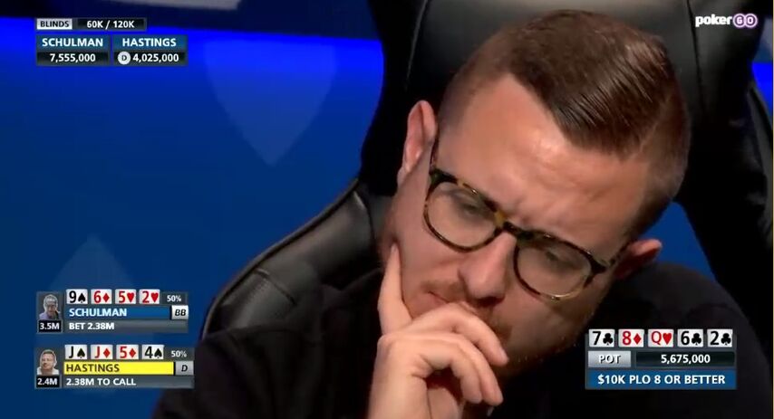 Турнир вполне мог закончиться на исходе третьего часа, когда Гастингс сделал рэйз 250k с Js Jd 5d 4s , а Шульман защитил 9s 6d 5h 2h . Флоп 7c 8d Qh прочекали, а на тёрне 6c обоим положили стрит и лоу. Шульман прочекал (он вообще чаще соперника ставил ловушки с сильными комбинациями, Гастингс проявлял куда больше нетерпения при доборе), Гастингс поставил 350k в банк 500k. Последовал рэйз 1.4 млн. Брайан заколлировал его, переходя к риверу с SPR 0.6 и 4% эквити. Практически на любой карте ривера он отдавал сопернику стек и поздравлял с победой в турнире. Но положили 2c , которая позволила ему поделить банк.