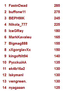 – и восемь человек отыграли все турниры: KKagomen, psion87, RakDoll, Fuklod13, BEPH9IK, PycckuiAA, FastnDead, MVSRss;