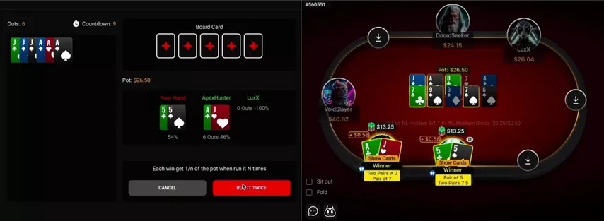 Также показали функцию Run It Twice. Судя по скриншоту, комиссия в кэше будет 5%.