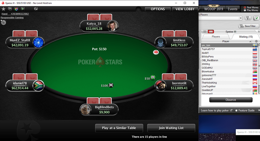 PokerStars, Hold'em No Limit – $50/$100 – 6 players