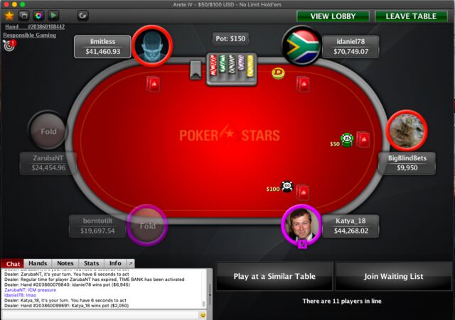 idaniel78: спасибо за веселье, ребята BigBlindBets: :) borntotilt: всегда пожалуйста =) Iimitless: невероятно :) Iimitless: покер <3 MunEZ_StaRR: раньше никогда не участвовал ни в чем подобном idaniel78: да уж idaniel78: вините pokerstars idaniel78: я пытаюсь получить доступ на 200/400 лол