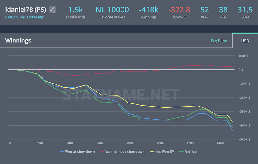 По данным Statname, idaniel сыграл 1.5k раздач и проиграл $418k.