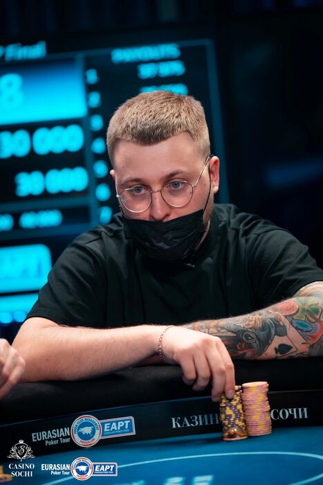 Мне 25 лет. В офлайн перешёл совсем недавно, успел побывать за TV финальным столом EAPT 2022 CUP, 3 место. Выигрыш составил 17,810 у.е. Эта была моя первая серия в офлайне. Теперь собираемся покорять офлайн покерный мир.