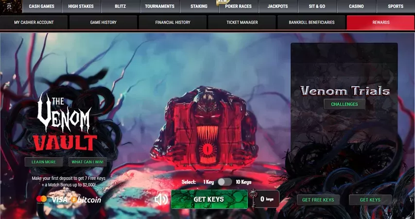 Меню Venom Vault расположено в разделе Rewards клиента. В нем можно открывать призовые сундуки при помощи ключей.