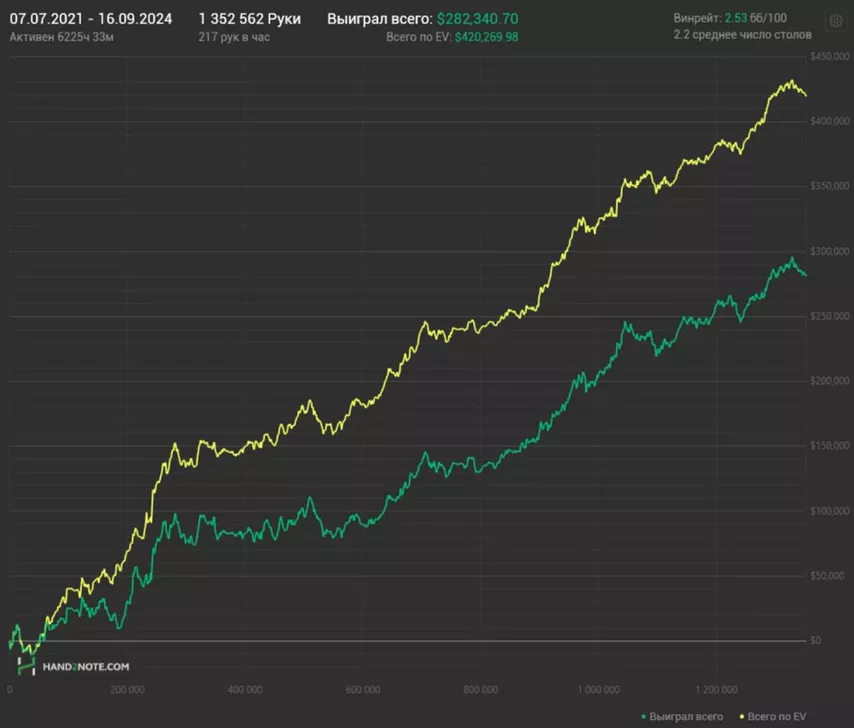 Когда честная и доступная игра в приложениях закончилась, я снова сел за PokerStars и начал с NL50, чтобы вспомнить механику игры. Постепенно прошел лимиты 100, 200, 500 – везде показывая хорошие винрейты и результаты – и в итоге включил NL1k. Этот путь занял около 9 месяцев. Хотя уверен, что многие с таким банкроллом сразу бы сели на NL1k.