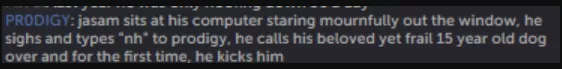 PR0DIGY: jasam сидит перед своим компьютером и с грустью смотрит в окно. Вздыхает и пишет prodigy «nh». Потом подзывает любимую, но уже ослабевшую собаку, которой 15 лет, и первый раз в жизни пинает ее.