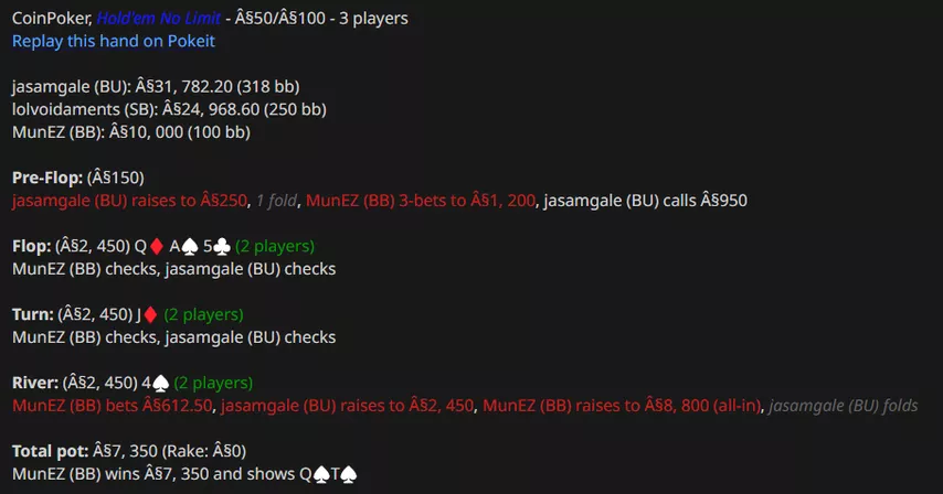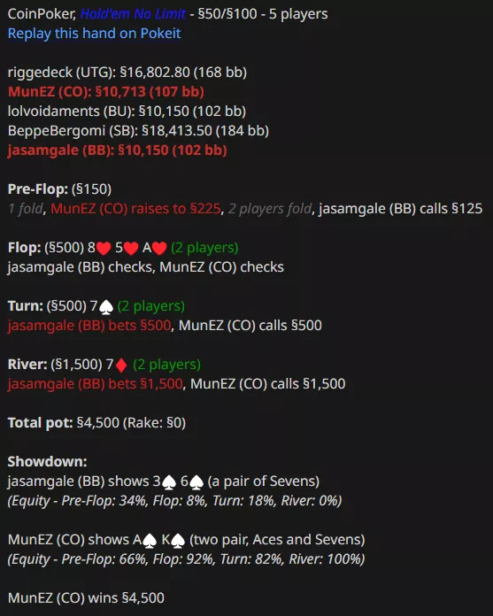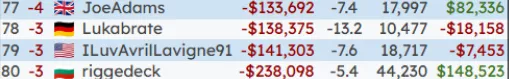 MunEZ проиграл $83k (-$15k по EV) за 44,000 раздачи (больше него сыграли только riggedeck и TaxHere).