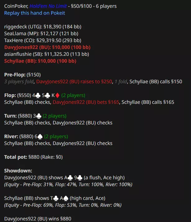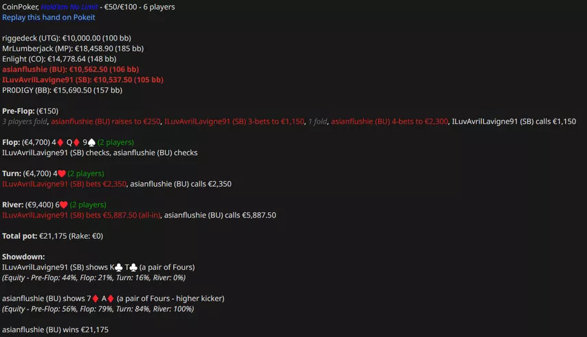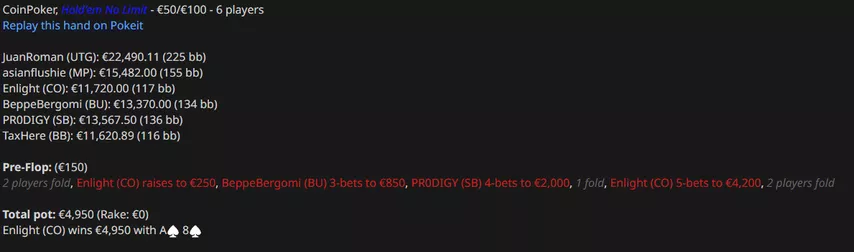 Asianflushie сыграл в небольшой плюс, выиграв $5k (минус $60k по EV). В одной из раздач он произвел впечатление на коллег коллом с А-хай.