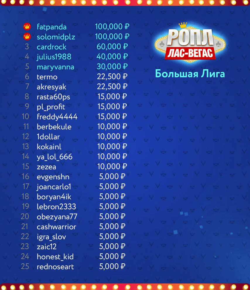 Восемь игроков приняли участие во всех турнирах, среди них один из победителей Большой лиги fatpanda. Именно «один из»: Лас-Вегас стал первым этапом в истории РОПЛ, когда два игрока на верхушке таблицы лидеров набрали одинаковое количество баллов. Solomidplz не сыграл в трех турнирах, зато показал больший КПД: вышел на пять финальных столов, дважды победил и дважды оставался на втором месте.