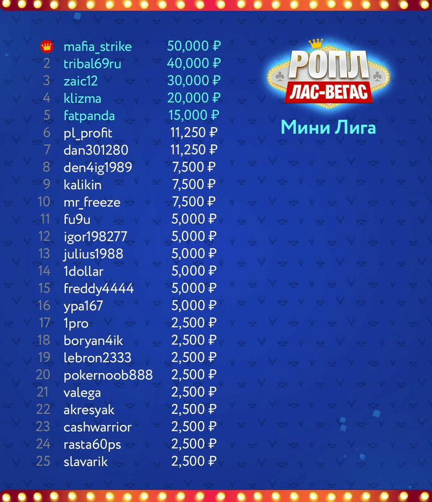 РОПЛ Лас-Вегас стал одним из самых выгодных для участия этапов. Особенно хорошо это видно на примере игроков Мини лиги. Суммарные призовые лидера составили 71,098 рублей, приз за первое место увеличил эту сумму на 70%! При этом победитель участвовал всего в 14 турнирах. Еще более наглядная ситуация с игроком, занявшим второе место: 56,179 рублей призовых и 40,000 рублей бонуса.