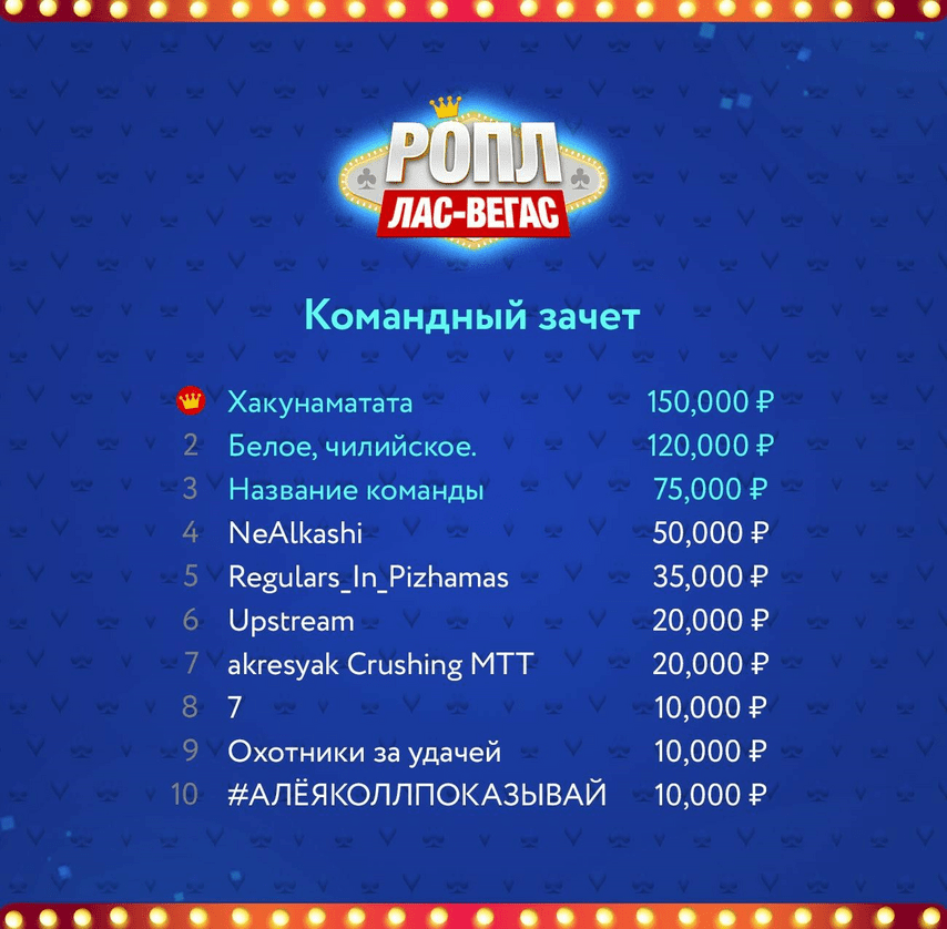 Благодарим всех за участие и поздравляем победителей! Призы уже начислены, браслеты победителям доставим курьером. Ждем всех на следующем этапе и напоминаем, что регистрация в командном турнире – однозначное плюс EV.