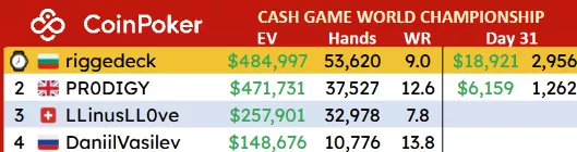 Больше всех раздач сыграли Кевин «TaxHere» Паке и riggedeck, последний стал самым стабильным игроком чемпионата. На протяжении всей дистанции регуляр из Болгарии шел в топ-3 или рядом, а за 4 дня до конца вообще лидировал.