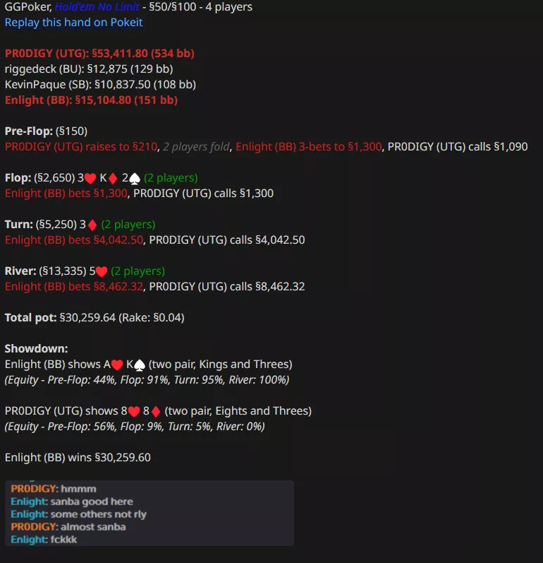 – Sanba – это 83o, zas (Ред. – ник Кудинова на PS) знаменит своими 3-/4-/5-бетами с этой рукой. Поэтому я заколлирвал с 88 из-за sanba-блокеров.