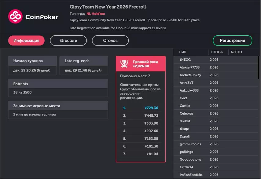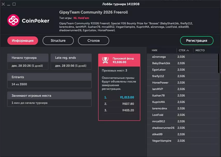 В этом турнире смогут принять участие все игроки, которые регистрировали аккаунт на CoinPoker с промокодами GipsyTeam.