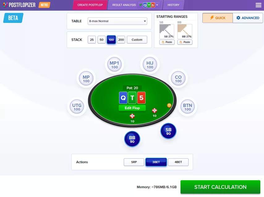 Quick Mode: Необходимость вводить огромное количество данных по раздачам – одна из проблем GTO-солверов, которая может быстро лишить игрока мотивации вообще разбираться в этой теме. Quick Mode упрощает и ускоряет этот процесс. Здесь легко настраивать размеры стека, исследовать различные сценарии изменений размера банка, а также определять рейнджи.