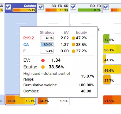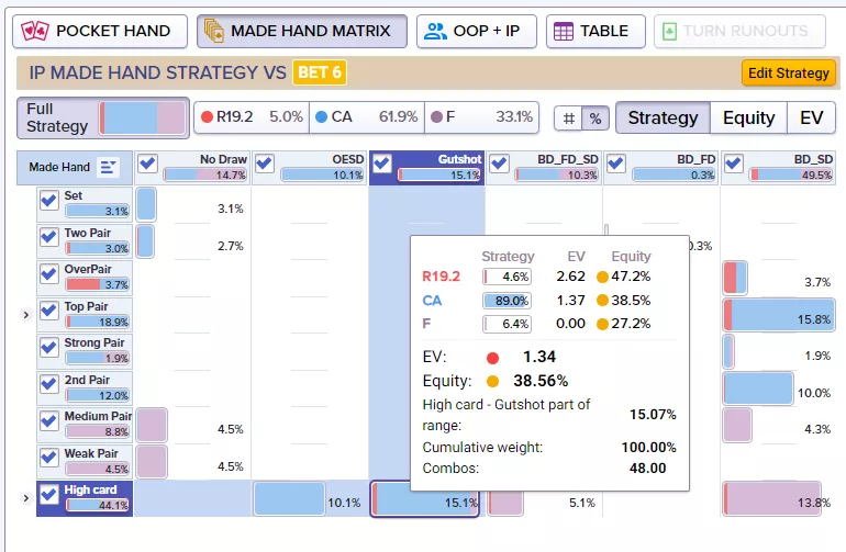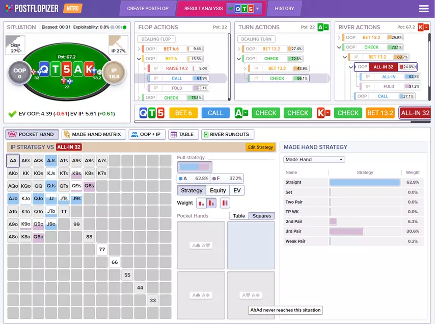 Пять аналитических режимов: Разработчики внедрили сразу пять режимов просмотра полученных вами расчётов, включая анализ ранаутов после каждой улицы торгов, вид OOP vs IP для удобного сравнения ваших комбинаций с картами оппонента, и Made Hand Matrix. Последняя функция есть только в Postflopizer: она позволяет увидеть, как должна меняться ваша стратегия в зависимости не только от силы вашей руки, но и от потенциала вашего дро.