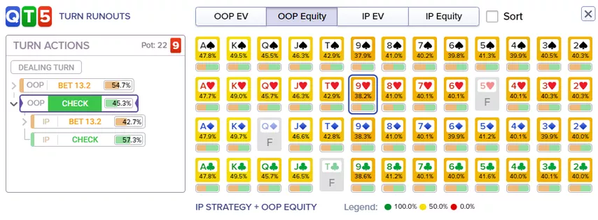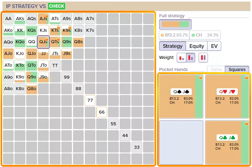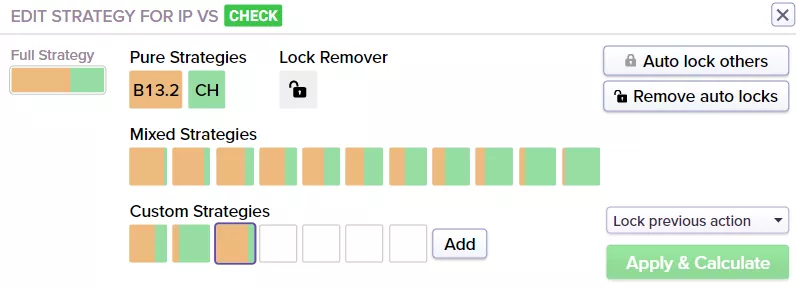 Возможность фиксировать ноды: Node Locking – это инструмент редактирования стратегий, который позволяет в нужных вам местах учитывать не идеальную GTO-игру в вакууме, а реальный стиль вашего соперника. Если вы знаете, что оппонент или вы сами в определённые моменты склонны вести себя так или иначе, эти данные можно ввести в Postflopizer и сразу увидеть, как в связи с этим меняются вероятности того или иного исхода, и какая контрстратегия является наиболее выгодной. Например, стоит ли играть агрессивнее, или, напротив, немедленно всё фолдить, а, может, вы и так всё делали верно.