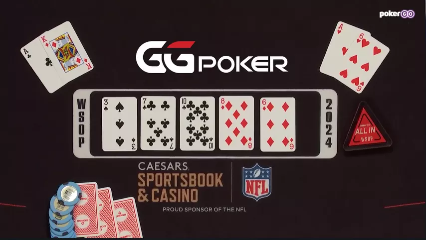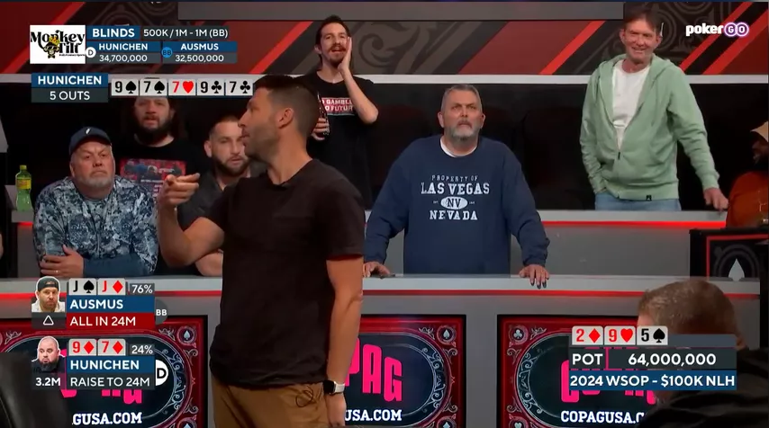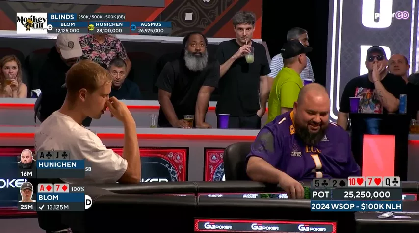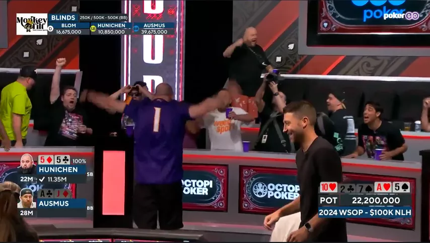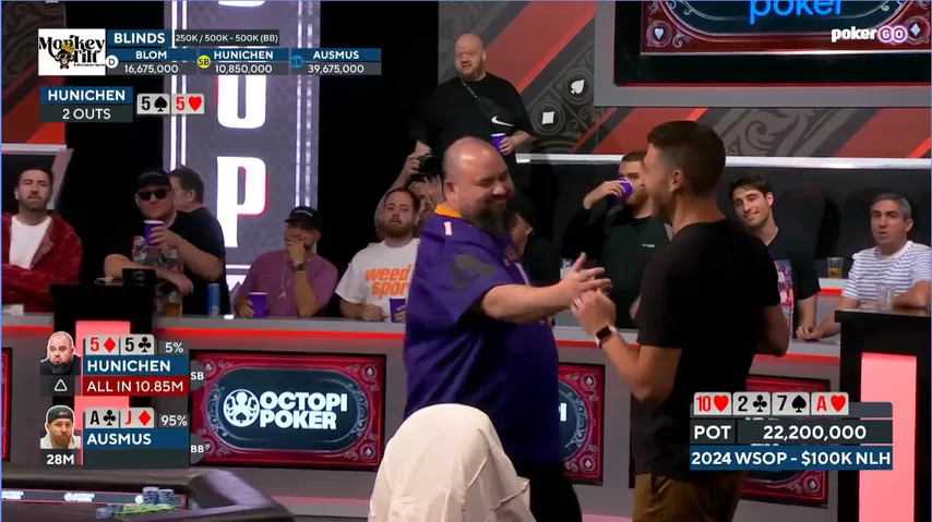 В самом начале хедз-апа Осмус удвоился с против . Но в заключительной раздаче Хуничен взял убедительный реванш. Игроки выставились на флопе с топ-парой против оверпары.