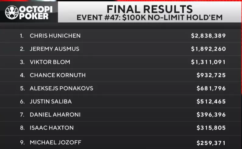 Турнир суперхайроллеров за $100,000 выиграл Крис Хуничен ($2,838,389).