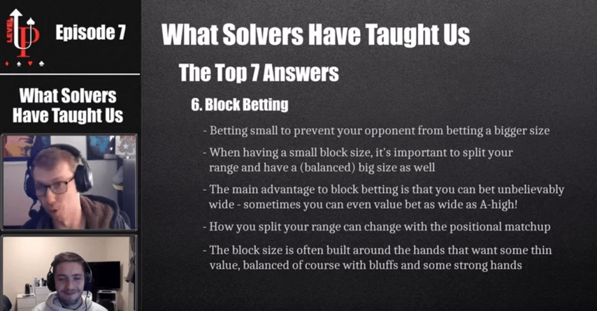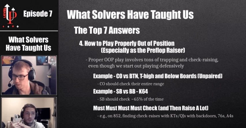С начала года на YT-канале школы Дага Полка выходит подкаст Level Up, специализирующийся на уроках покера для квалифицированных игроков. Самый эффектный из них посвящен главным стратегическим приёмам, которые игроки открыли для себя после появления солверов. Какие-то из них регуляры понимали интуитивно и раньше, другие стали настоящей революцией.