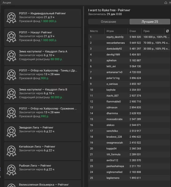 - 1 место: 100,000 рублей на счет, 100% рейкбек в руме на месяц + уникальная иконка чемпиона