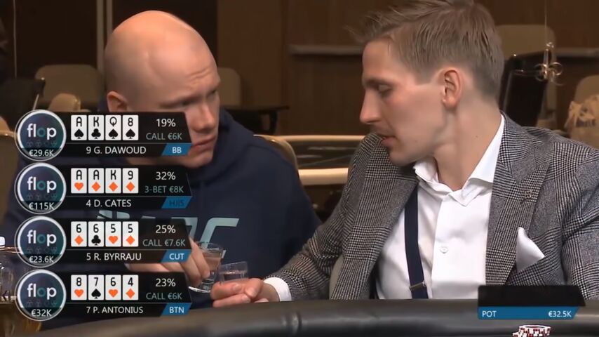 Всё началось с того, что Патрик Антониус, кумир моего детства, пригласил меня принять участие в кэш-игре в пот-лимитную омаху с блайндами 100/200 и страддлом 400 евро, которая транслировалась в прямом эфире. Встреча с кумиром и дорогая игра на камеру приведут в трепет кого угодно, и я тоже довольно сильно нервничал. К счастью, у меня было припасено решение – снять напряжение парой бокалов вина. Идеальный выход.