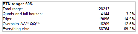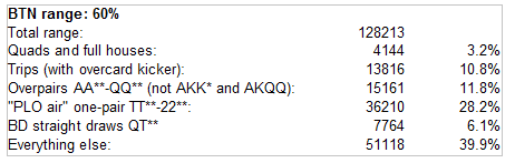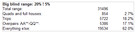Воспользуемся ProPokerTools Odds Oracle, чтобы разложить диапазон соперника. При подсчете мы постарались не считать одни и те же руки дважды, например, при определении количества оверпар KK** мы не включаем в их число ранее посчитанные KKJ*, KK33 и AAKK.