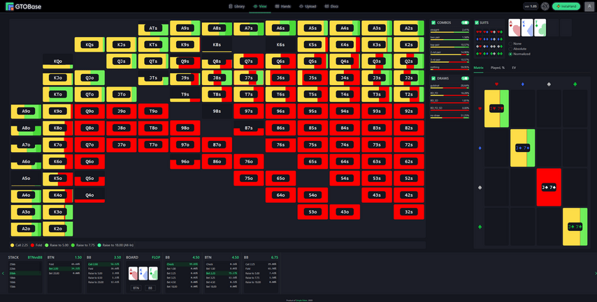 – Визуализатор рассчитанных GTO-стратегии (от префлопа до ривера) с различными представлениями и удобными фильтрами.