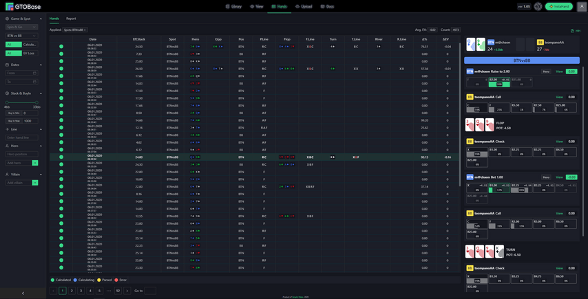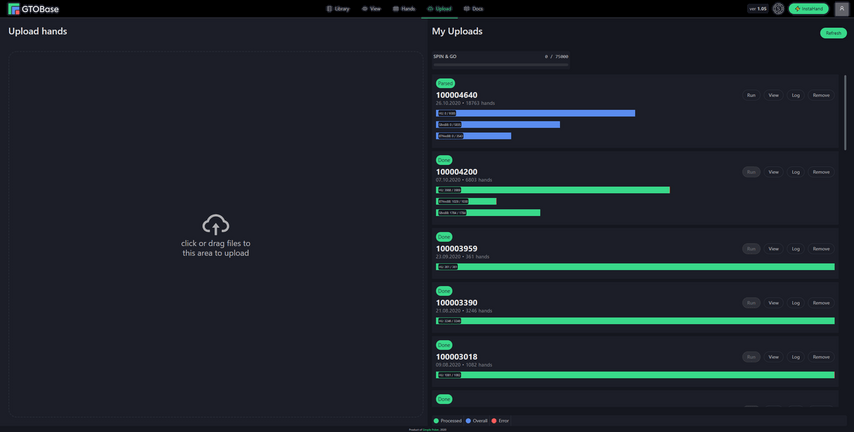 – Для анализа истории раздач используются мощности серверов GTOBase. Таким образом приложение не использует ресурсы ПК пользователя при выполнении анализа раздач и не требует наличия лицензии солвера. Вы просто загружаете раздачи и ожидаете, когда анализ будет произведен. При этом свой компьютер в этот период вы можете выключить. Руки обрабатывается со скоростью до 200 раздач в минуту.