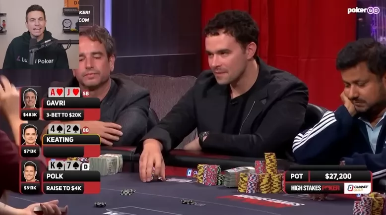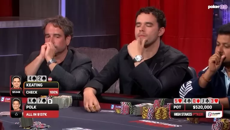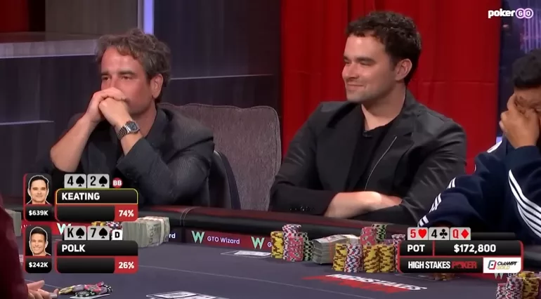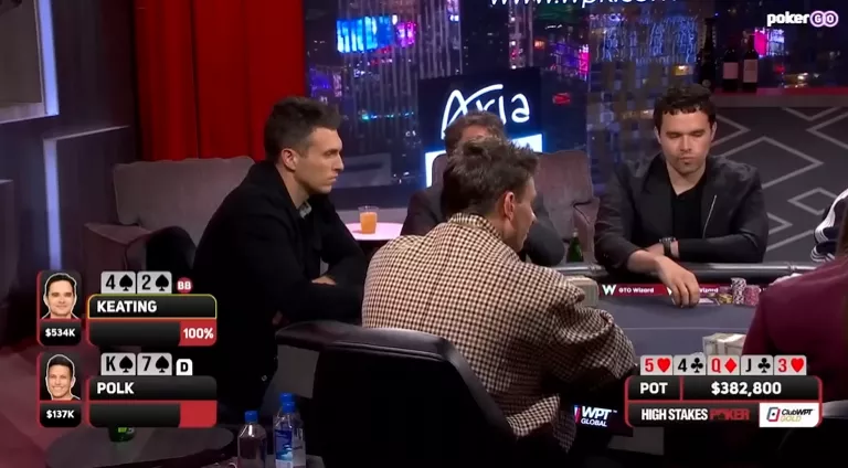 Переставляю до $75,000. Всё складывается идеально: Гаври фолдит лучшую руку, а Китинг делает колл с 4-хай, и мы идём смотреть флоп с двумя премиумными стартерами.