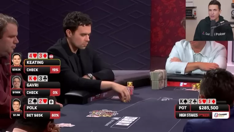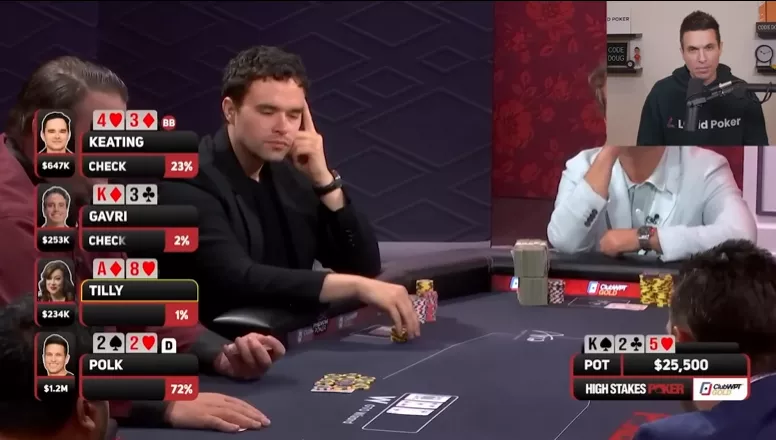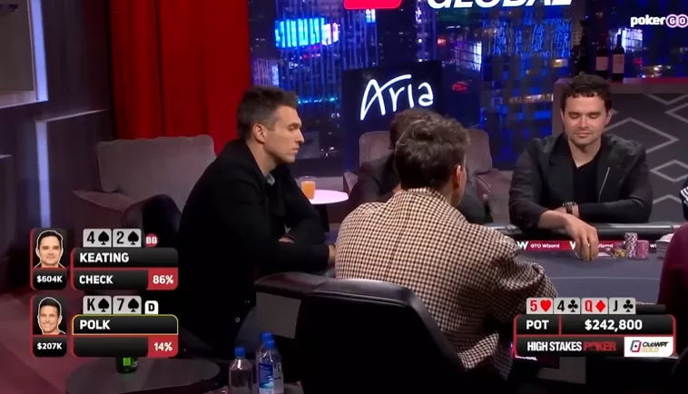 На ривере падает двойка, и теперь чтобы получить что-то от руки Китинга, у которого слабейшая возможная рука, натсовое лоу, Кики должен чекать. В нормальной игре нужно ставить, чтобы добрать с пятёрки, но если есть основания полагать, что нас часто будут флоатить, – очень хорошая рука для чека: мы блокируем пятёрку и не блокируем никакие дро.